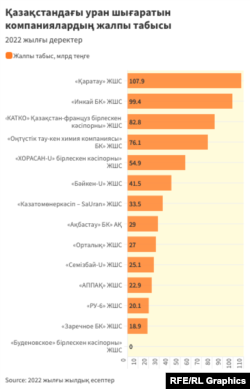 2022 жылғы мәлімет бойынша, "Қазатомөнеркәсіп" Қазақстанда өндірілген барлық уранның 53,5 пайызын, яғни 21 мың тоннаның 11 мыңын өндірген. Оператор өндіріс көлемін ұлғайту туралы уәде беруден танбады, бірақ әлемдік баға құлдырағанда бағаны ұстап тұру үшін өндіріс қарқынын бәсеңдетті. "Қазатомөнеркәсіп" өндірісті 31,5 мың тоннаға дейін арттыра алатынын айтады.