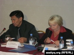 Қазақстан президентінің кеңесшісі Ермұхамет Ертісбаев (сол жақта) пен "Әділ сөз" қорының басшысы Тамара Калеева. Астана, 27 қыркүйек 2010 жыл