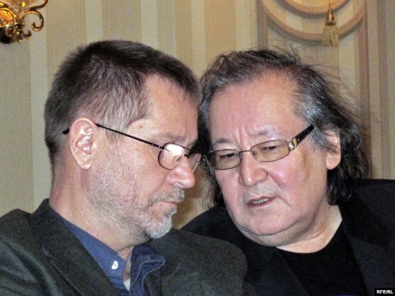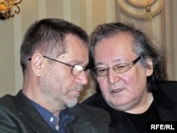 Режиссер Болат Атабаев (оң жақта) пен тәуелсіз журналист Сергей Дуванов марқұм Алтынбек Сәрсенбайұлын еске алу жиынында. Алматы, 10 ақпан 2010 жыл.