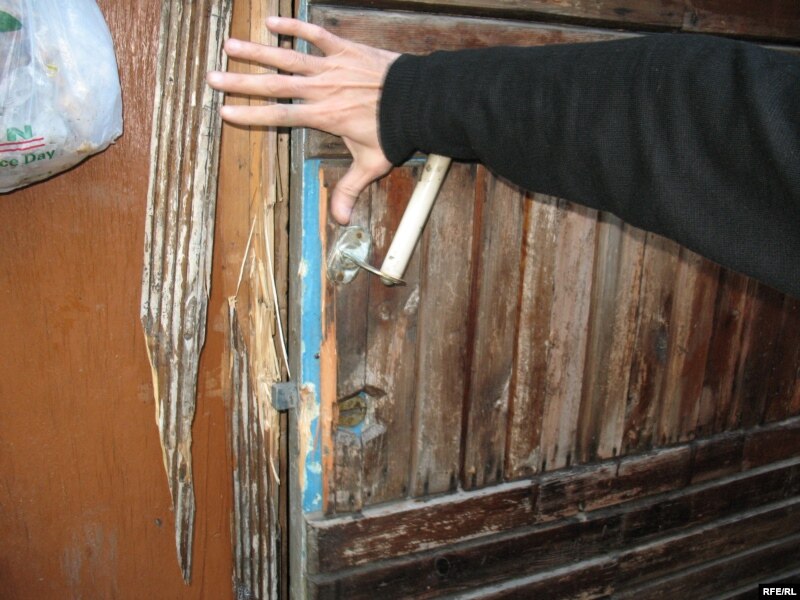 Өзбек босқындарының айтуынша, ҰҚК қызметкерлері олар тұрып жатқан үйдегі осы сарайдың есігін бұзып, ішінен қару іздеген. Алматы, 7 қыркүйек 2009 жыл.