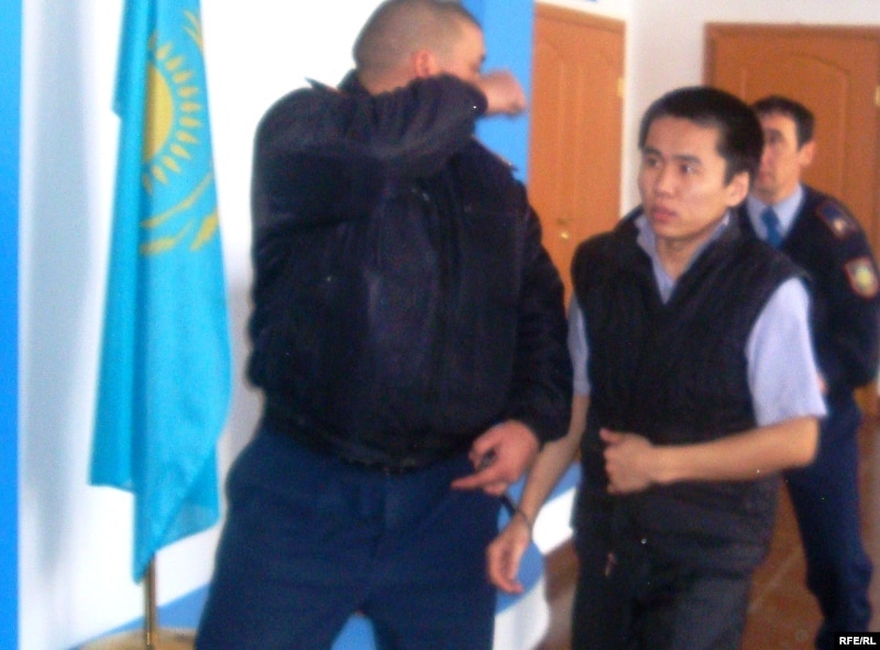 Айдауылдар «кісі өлтірді» деген айып тағылған Асхат Сүйеуовты (ортада) сот залына әкеле жатыр. Атырау, 15 сәуір 2010 жыл.