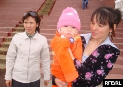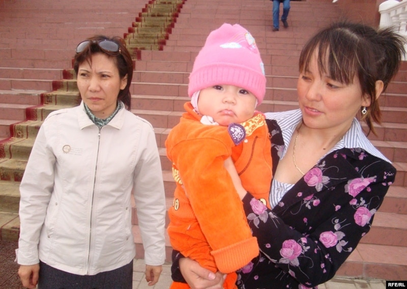 Айгүл Сүйеуова келіні және немересімен бірге облыстық сот ғимараты алдында. Атырау, 15 сәуір 2010 жыл.