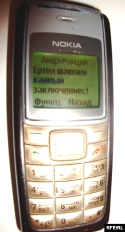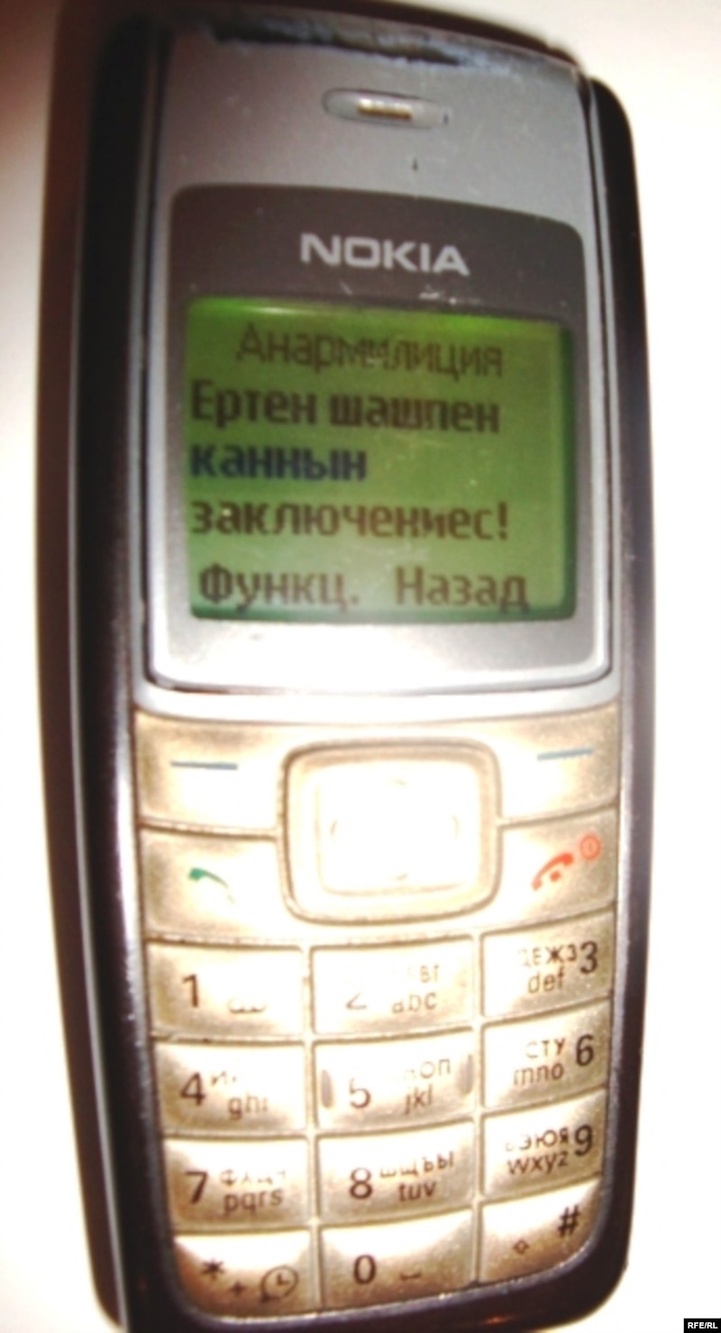 Айыпталып отырғандардың бірінің анасының қол телефонында сақталған жазбаша хабарлама. Ол мұны өзінен ақша талап еткен полиция офицері жіберді дейді. Атырау, 9 желтоқсан 2009 жыл.