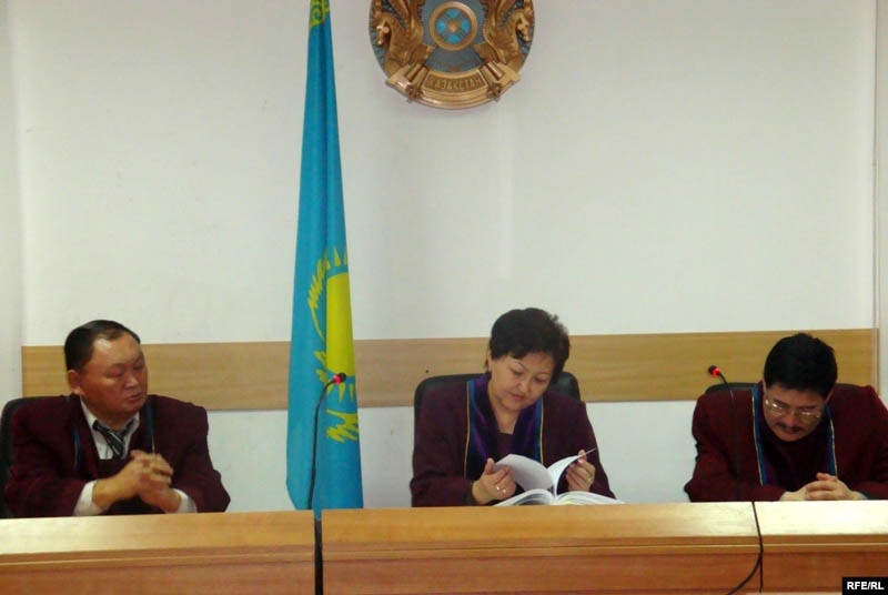 Атырау облыстық соты алқасының судьялары (солдан оңға қарай) Таңатар Сатайбаев, Раиса Аққұлова (төрағалық етуші), Мәтен Ерәлиев. Атырау, 3 желтоқсан 2009 ж.