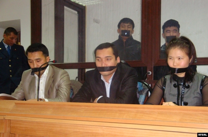 Aйыпталушылардың қорғаушылары (солдан оңға қарай): Нұрлан Жолболов, Қанат Демесінов және Ақтолқын Балтабаева өздері келтірген айғақтарды назарға алмаған сотқа наразылық ретінде ауыздарын қара лентамен таңып алды. Атырау, 3 желтоқсан 2009 жыл.