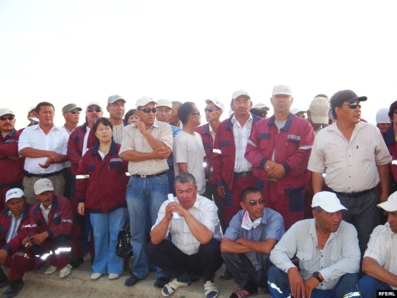 «Жайықмұнайгаз» компаниясының ондаған мұнайшысы аштық жариялап жатқан он жұмысшыға қолдау ретінде жұмысты тоқтатты. Аққыстау ауылы, Исатай ауданы, Атырау облысы. 3 шілде 2010 жыл.