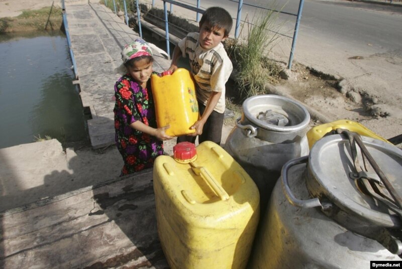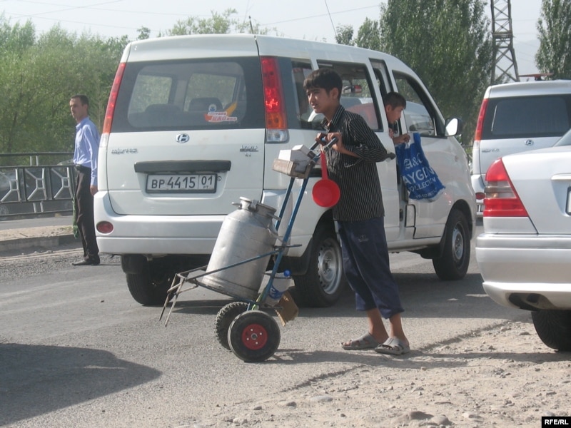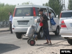 Тәжікстан астанасында су құйылған ыдысты қоларбаға салып келе жатқан бала. Душанбе, маусым, 2008 жыл.