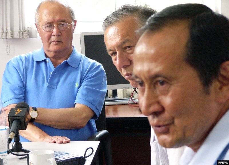 Мәдениеттанушы Мұрат Әуезов (сол жақта) және ұйғыр қауымдастығының мүшелері Аруп Мусабаев (ортада) пен Қаһарман Қожамберді Азаттықтың Алматыдағы бюросында өткізілген дөңгелек үстел отырысында. 9 шілде 2009 жыл.