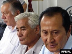 Қазақ ақыны Дәулетбек Байтұрсынұлы (сол жақта), Қазақстан ұйғыр қауымдастығының мүшесі Әбдужәлел Хамрам және «Жұлдыз» журналының бас редакторы ақын Ұлықбек Есдәулет Азаттық радиосының Алматыдағы бюросында Үрімжідегі ұйғырлар наразылығы туралы дөңгелек үстел отырысында. 9 шілде, 2009 жыл.