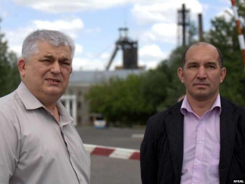 Қарағанды облыстық төтенше жағдайлар жөніндегі департамент қызметкері Станислав Сытник (сол жақта) пен «Қорғау» кәсіподақтар қауымдастығының төрағасы Марат Миргоязов. Қарағанды облысы, 24 маусым 2010 жыл.