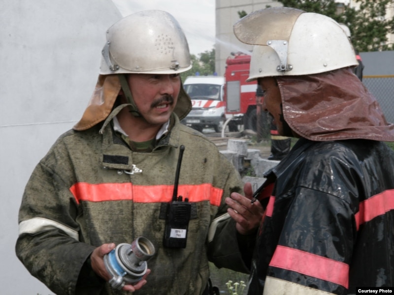 Өрт сөндіруші Марат Кеңесбаев (сол жақта). Қостанай облыстық өрт сөндіру және авариялық құтқару жұмыстары қызметінің суреті.