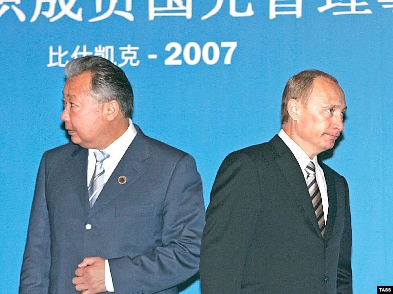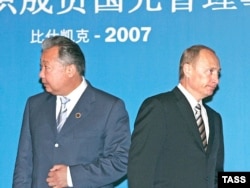 Қырғыз президенті Құрманбек Бакиев (сол жақта) пен Ресейдің сол кездегі президенті Владимир Путин Шанхай ынтмақтастығы ұйымына мүше елдер басшыларының саммитінде. Бішкек, 16 тамыз 2007 жыл.