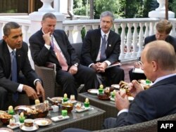 АҚШ президенті Барак Обама (сол жақта) Ресей премьер-министрі Владимир Путинмен (оң жақта) кездесіп, шай ішті. 7 шілде 2009 жыл.
