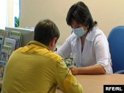 «Казкоммерцбанктың» Петропавлдағы бөлімшесінің қызметкері бетперде тағып жұмыс істеуде. 6 тамыз 2009 жыл.