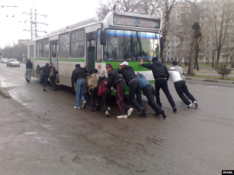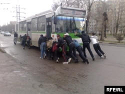 Бір топ адам Душанбе көшесінде келе жатып тоқтап қалған троллейбусты итеріп барады. 16 ақпан 2010 жыл.