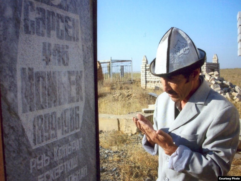 Темірхан Момбекұлы ұзақ сапар кезінде әкесінің басына келіп, құран бағыштап тұр. Жеке мұрағаттағы сурет.