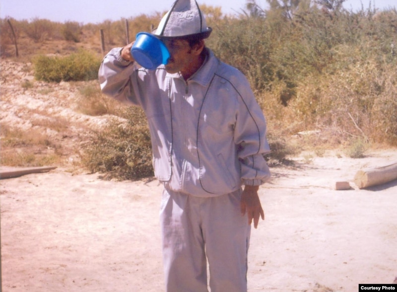 Темірхан Момбекұлы Қорасан баба басындағы қасиетті судан ішіп тұр, Қызылорда облысы. Жеке мұрағаттағы сурет.
