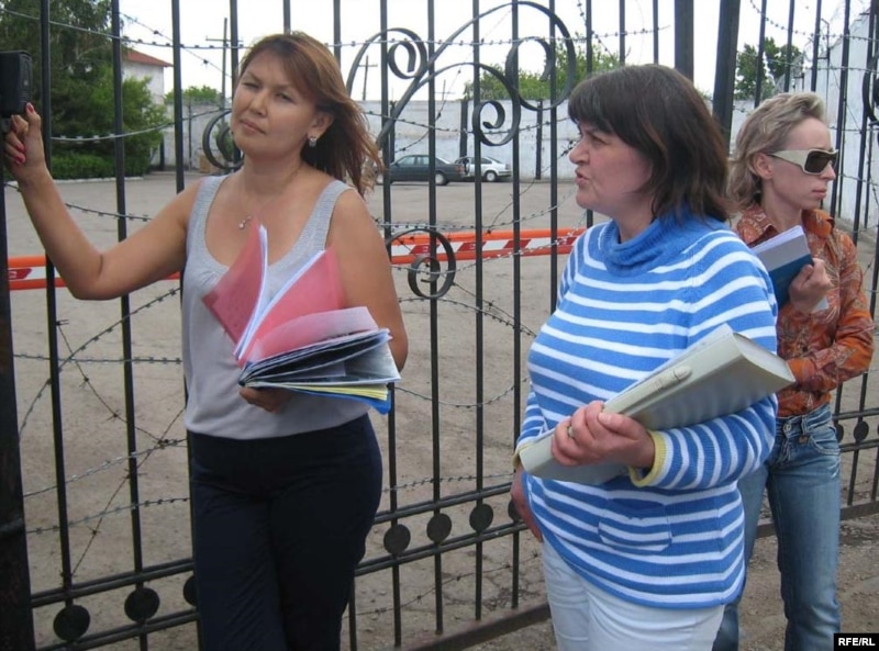 «Қазатомпром» компаниясының тұтқындағы басқарушыларының әйелдері (солдан оңға қарай): Жәмила Жәкішева, Марика Цоцория және Наталья Парфенова күйеулерімен кездестіруді талап етіп, ҰҚК-нің абақтысының алдында тұр. Астана, 4 маусым 2009 ж.