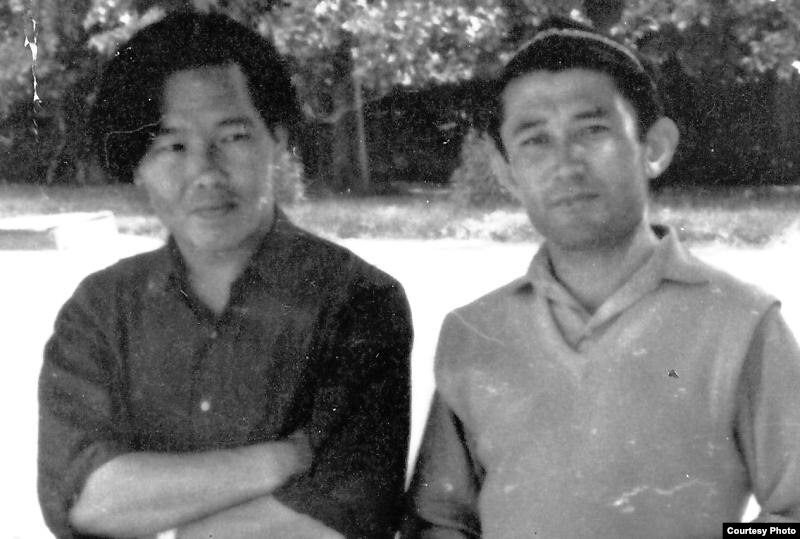 Ақын Жұмекен Нәжімеденов (сол жақта) композитор Шәмші Қалдаяқовпен бірге, Алматы, 1963 жыл. Жеке мұрағаттағы сурет.