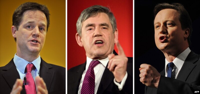 Солдан оңға қарай либерал-демократ Ник Клегг, премьер-министр лейборист Гордон Браун және консерватор Дэвид Камерон