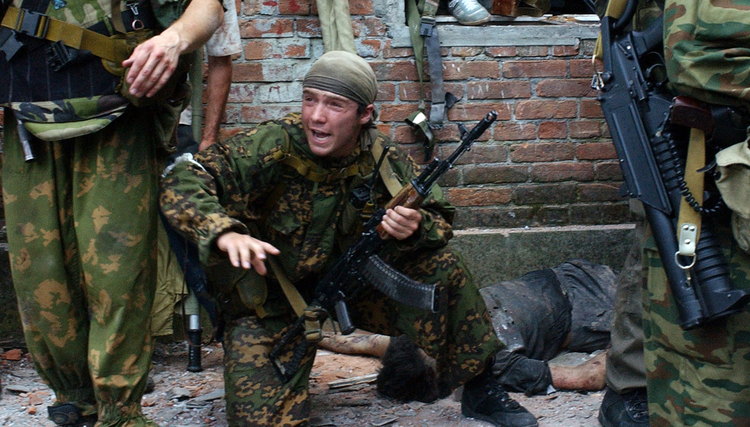 Террористер басып алған мектептің маңында жүрген Ресей арнайы жасағы. 1 қыркүйек 2004 жыл.