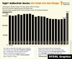 2020 жылы Қазақстанда 162 мың адам қайтыс болды. Бұл 2019 жылғы көрсеткіштен 30 мыңға көп. Қазақстанда мұндай өлім статистикасы соңғы 20 жылда болмаған.