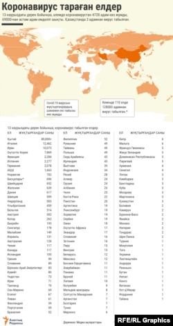 13 наурыздағы дерек бойынша, коронавирус тараған елдер мен жұқтырғандар санын ұсынамыз. Суретті үстінен бассаңыз үлкейеді.