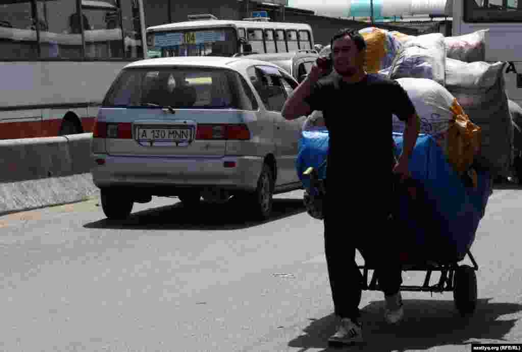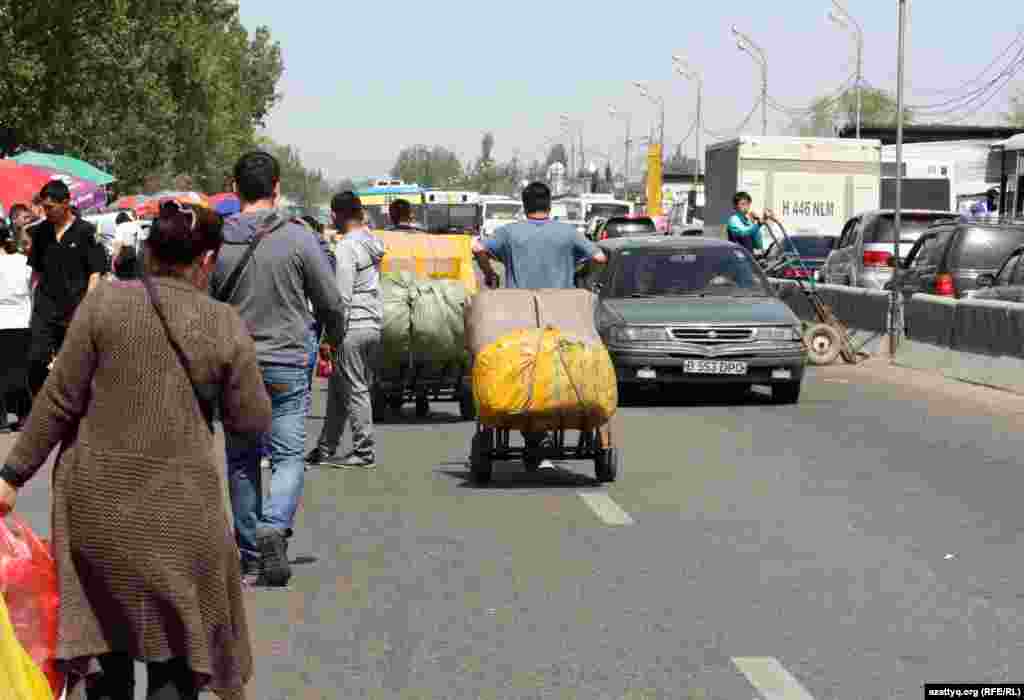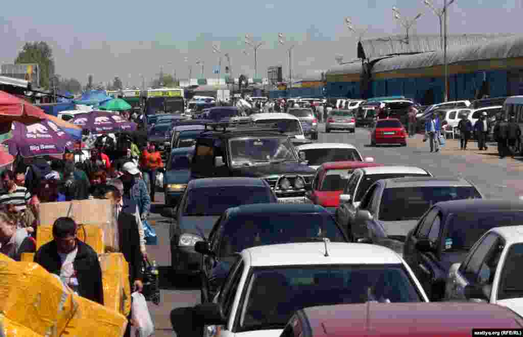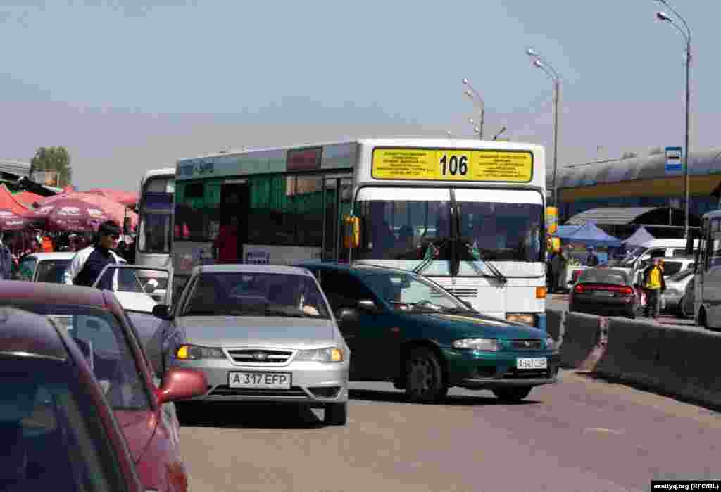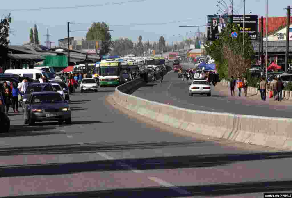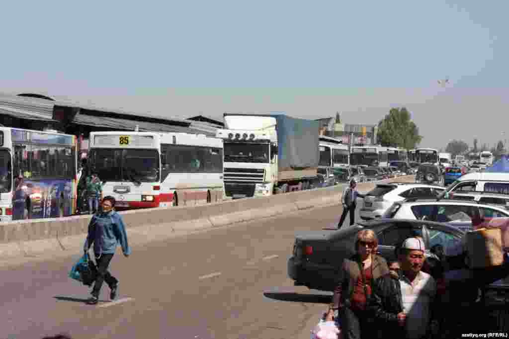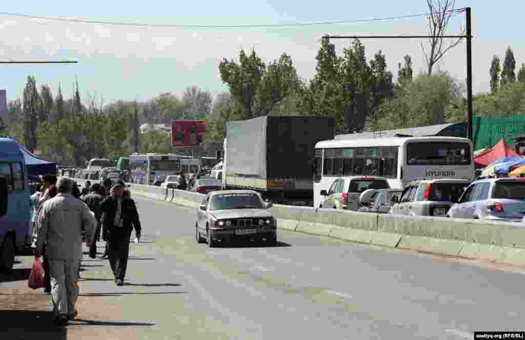 Алматы "барахолкасында" жаяулар мен арбакештер көлік жолы бойымен жүруге мәжбүр. Автобустар мен таксилер де жол ортасына тоқтап, жолаушы тасымалдайды. Сондықтан бұл жер көлік кептелісінен арылмайды. 23 сәуір, 2013 жыл.