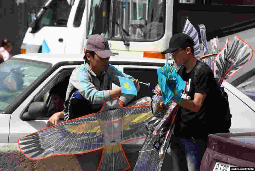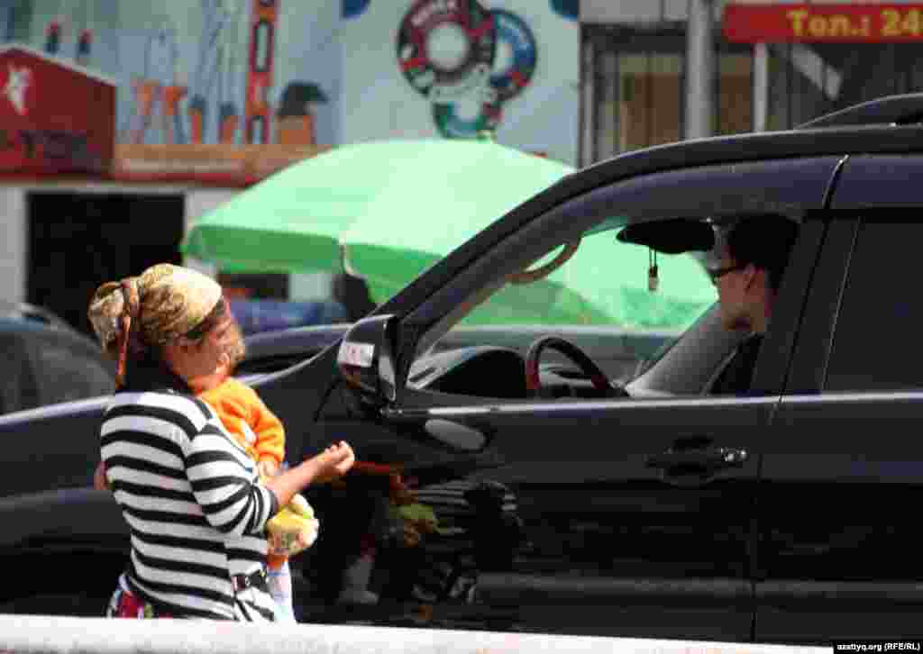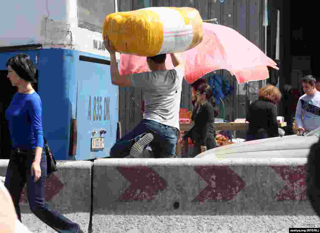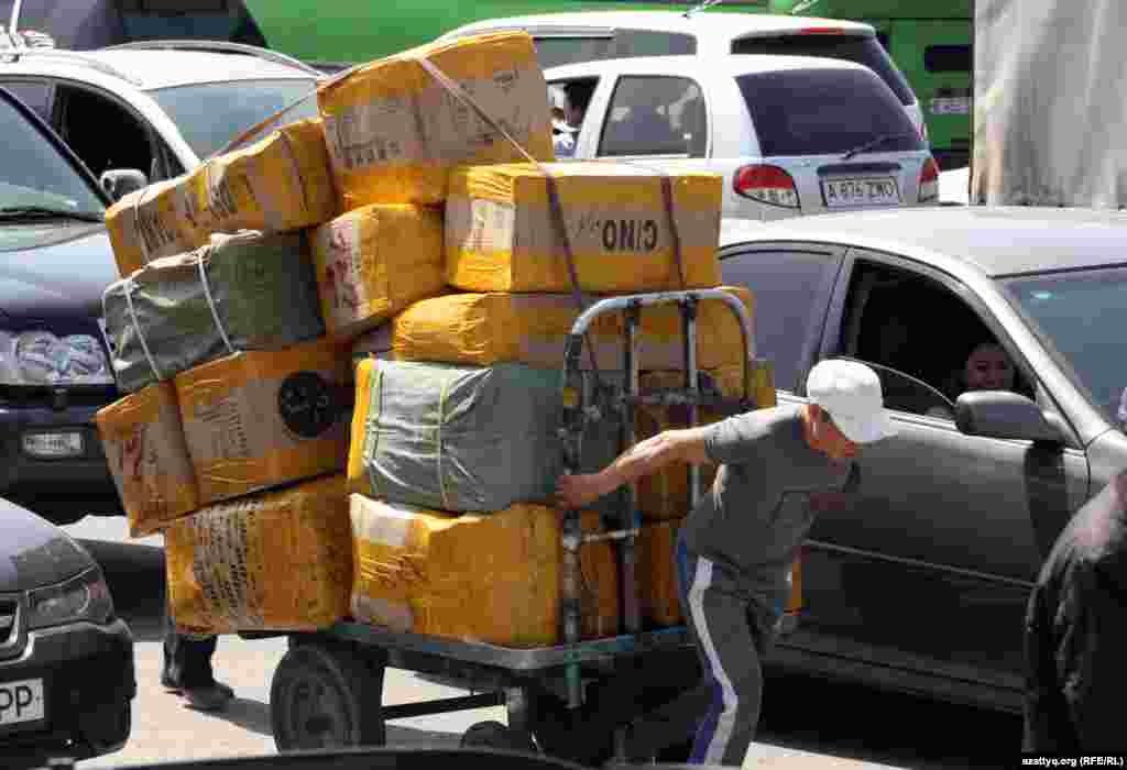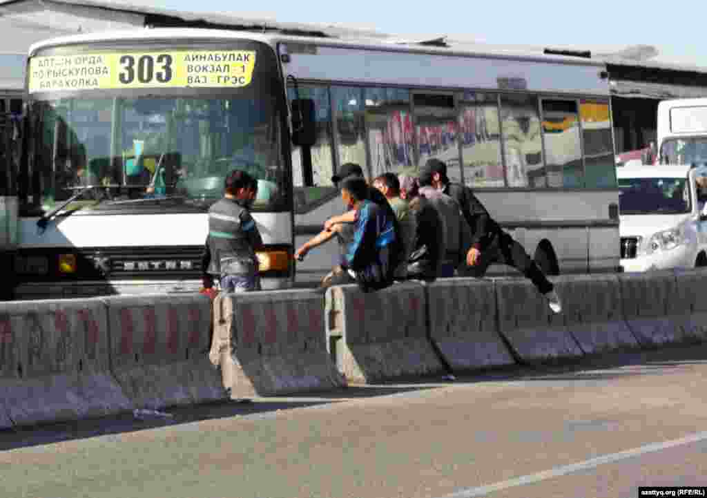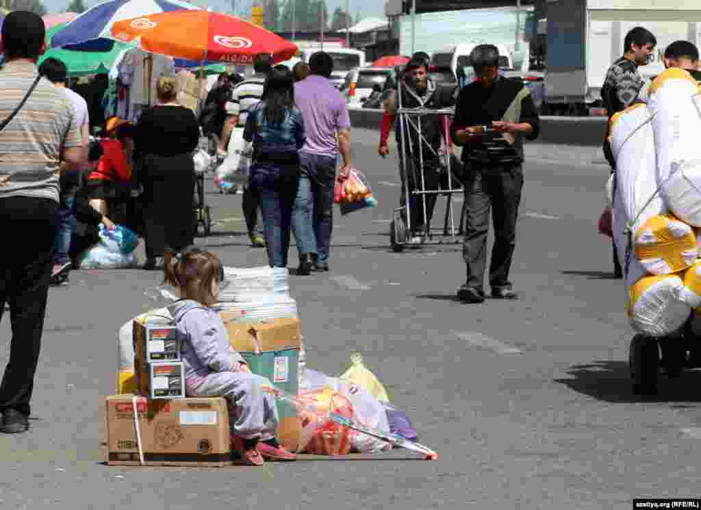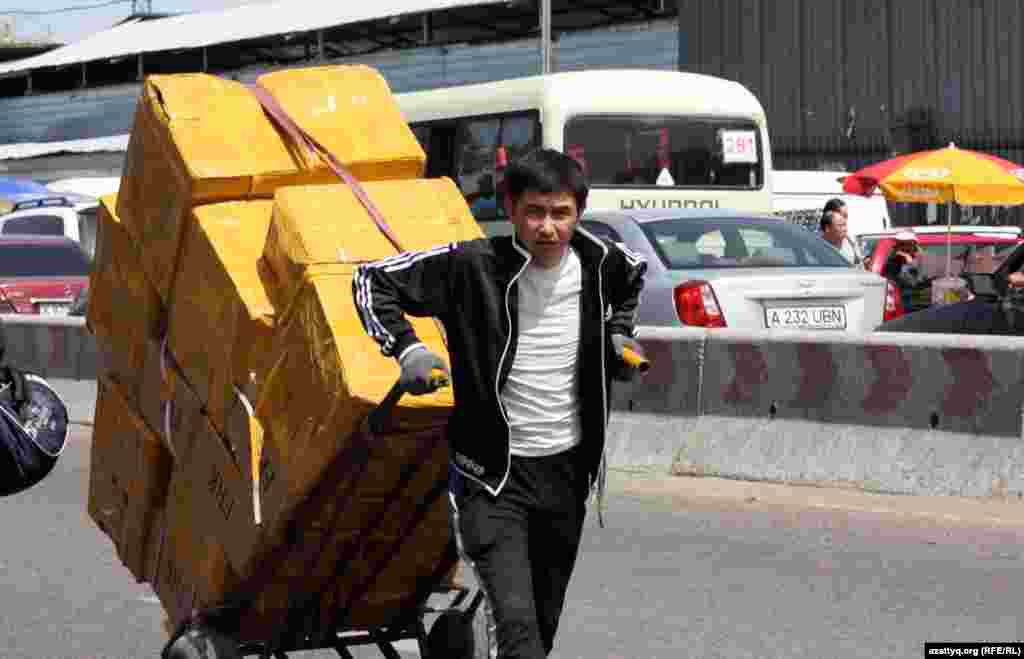 Алматы "барахолкасында" жаяулар мен арбакештер көлік жолы бойымен жүруге мәжбүр. Автобустар мен таксилер де жол ортасына тоқтап, жолаушы тасымалдайды. Сондықтан бұл жер көлік кептелісінен арылмайды. 23 сәуір, 2013 жыл.