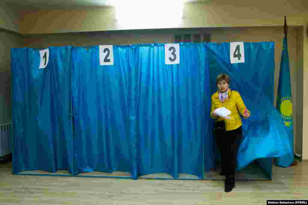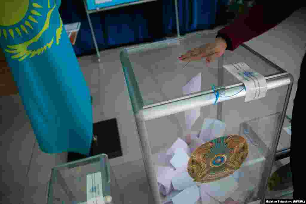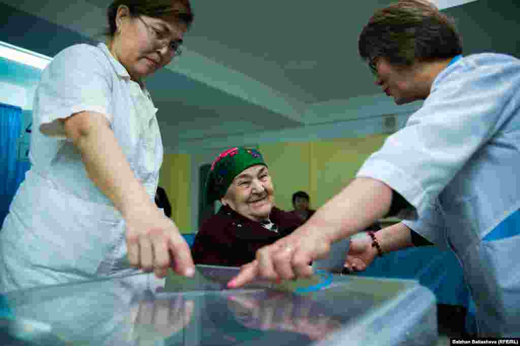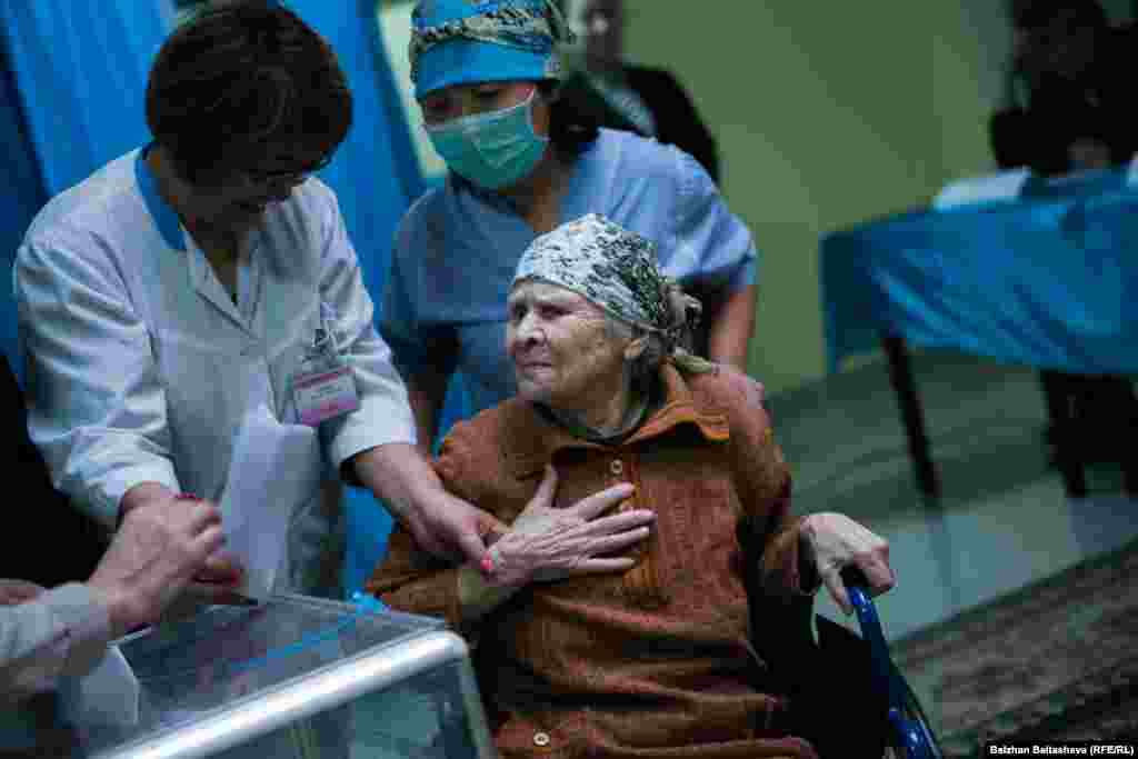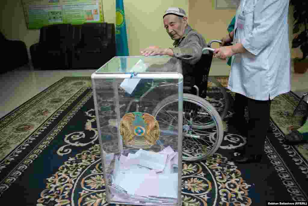 Азаттықтың фото тілшісі Алматыдағы бірнеше сайлау учаскесіне барып, мерзімінен ерте ұйымдастырылған мәжіліс пен мәлихат сайлауы кезінде дауыс беріп жатқан адамдардың дені қариялар екенін байқады. 20 наурыз 2016 жыл.