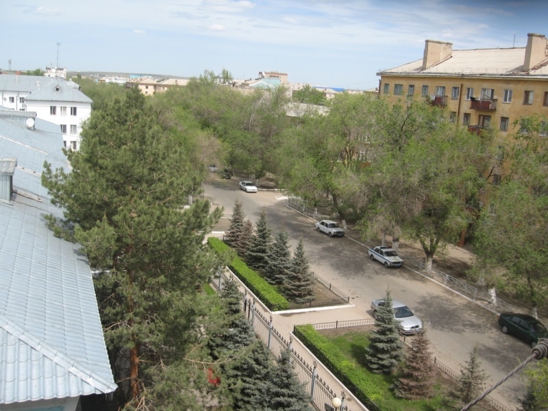 Бомба жарылған аумақ. Сол жақтағы – облыстық ішкі істер басқармасы ғимаратының шатыры. Ақтөбе, 17 мамыр 2011 жыл.
