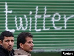 Оппозиция жақтастары Каирдің Тахрир алаңындағы Twitter әлеуметтік желісіне сілтеме жасалған жазудың түбінде тұр. Египет, 5 ақпан 2011 жыл.