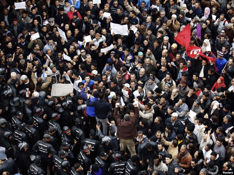 Тунистегі шерушілер мен арнайы жасақтың қақтығысы. Тунис, 20 қаңтар 2011 жыл.