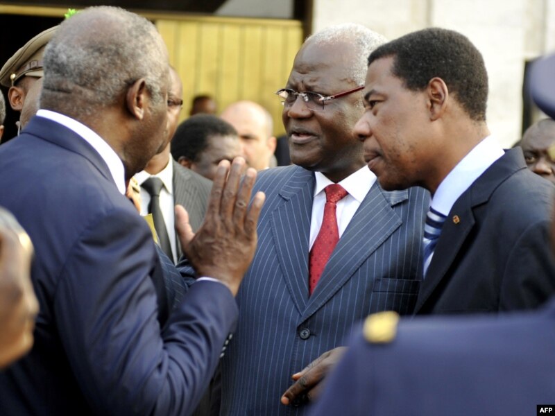 Лоран Гбагбомен (сол) кездескен Сьерра-Леоне президенті Эрнест Корома (ортада) және Бенин президенті Бони Яи (оң). Абиджан, 28 желтоқсан 2010 жыл.