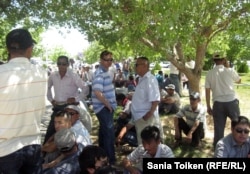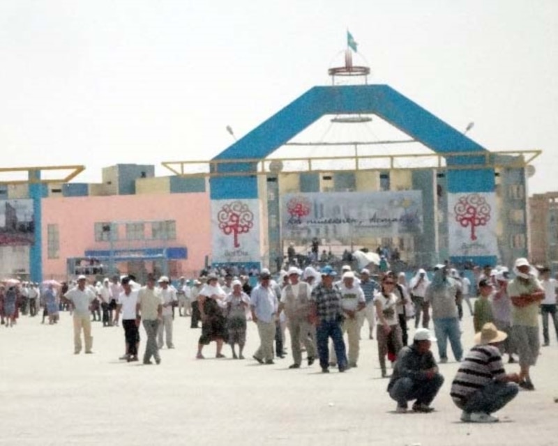 Жаңаөзен қаласындағы әкімдік ғимараты жанындағы "Тәуелсіздік" алаңына жиналған мұнайшылар және олардың отбасылары. Жаңаөзен қаласы, 10 шілде 2011 жыл.
