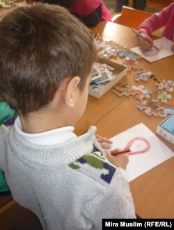 ВИЧ дертіне шалдыққан ұл бала СПИД-ке қарсы күрес белгісінің суретін салып отыр, «Ана мен бала» орталығы, Шымкент, 30 қараша, 2010 жыл.