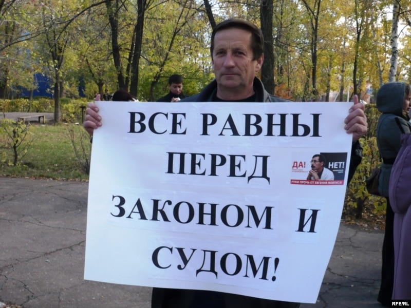 қолдау кезінде "Заң мен сот алдында барлығы бірдей!" деп жазылған плакат алып шықты.