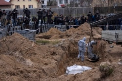 • Бұл Ресей әскері кеткеннен кейін Киев облысынан табылған көптеген зираттардың бірі. Ресей Буча, Бородянск және Киев түбіндегі өзге қалалардағы қырғынға қатысы барын мойындамай келеді.