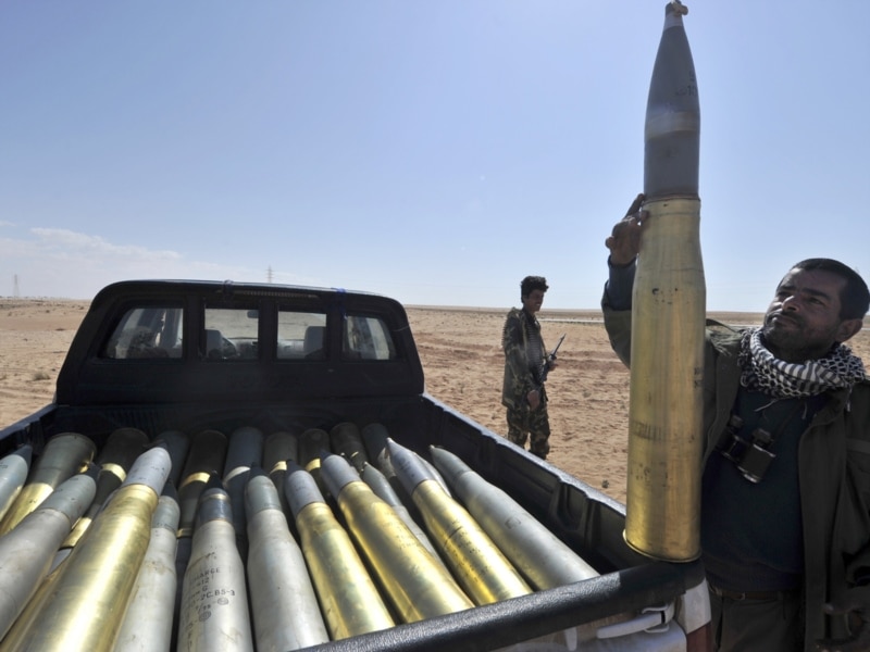 Ливиялық көтерілісшілер талқандалған үкімет күштерінің қару-жарағын олжалап жатыр. Адждабия аймағы, 23 наурыз 2011 жыл